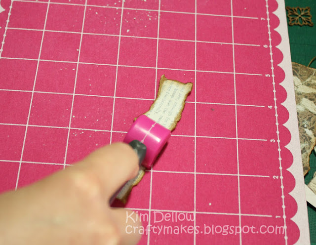 I then used Archival ink to stamp out the Carmen Medlin SCACD stamp onto the book page and on a piece of vellum, but I didn't have any vellum so I've actually used tracing paper. Allow the ink to dry then line up the two images and tear to the size you want the image to be on the card. Also tear the edges of the Kraft card blank.